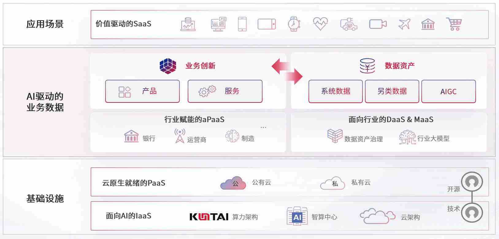 数字时代,,,,围绕企业数字化转型的关键要素,,,58彩票网数码开创性的提出数云融合战略和技术体系框架,,,,着力在云原生、、、、数字原生、、、AI原生和信创产业上架构产品和服务能力,,,,为处在不同数字化转型阶段的快消零售、、、汽车、、、、金融、、、医疗、、、政企、、教育、、、、运营商等行业客户提供泛在的敏捷IT能力和融合的数据驱动能力,,构建跨界融合创新的数字业务场景和新业务模式,,助力企业级客户建立面向未来的核心能力和竞争优势,,全面推动社会的数字化、、智能化转型升级。。。
